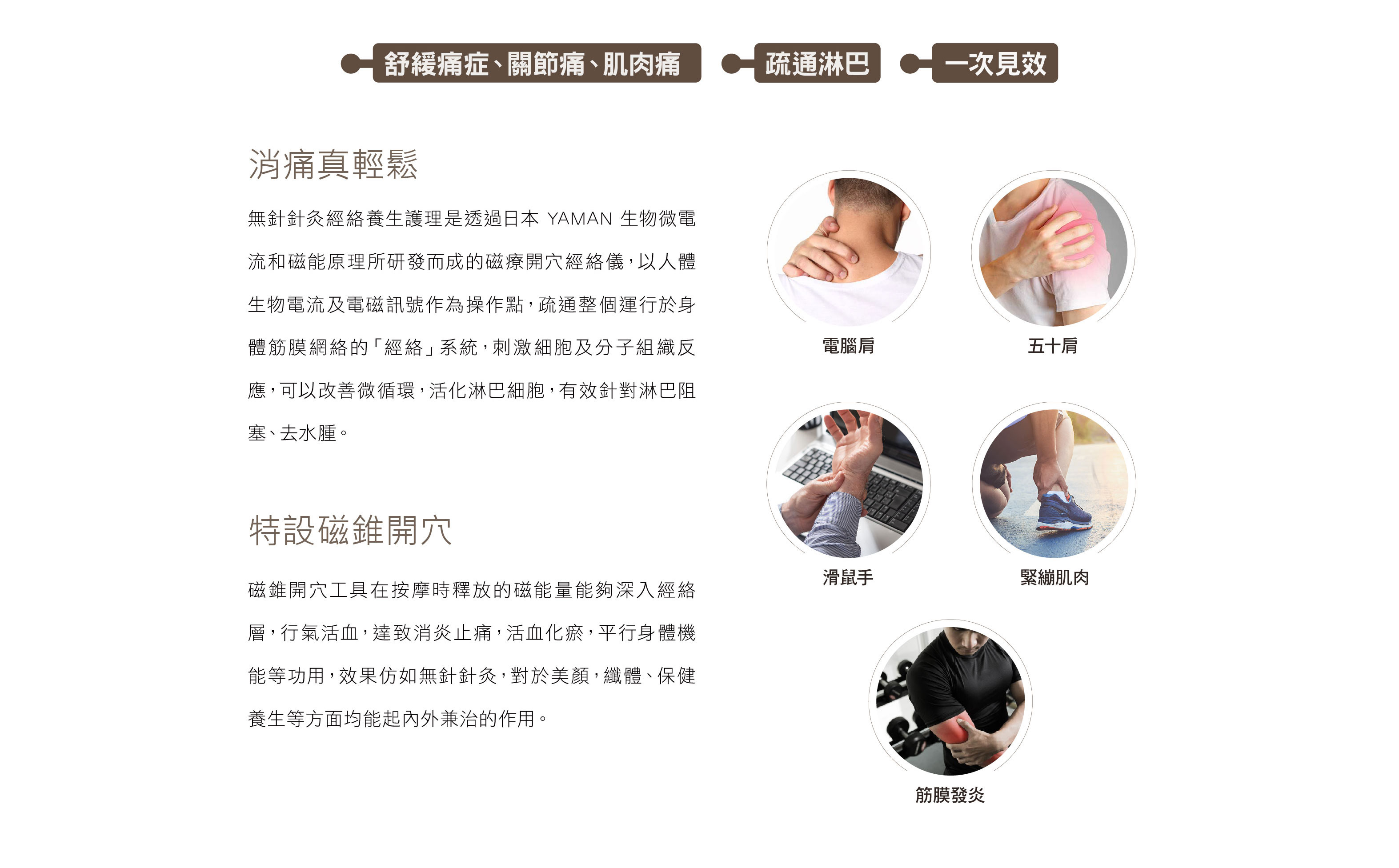 無痛無針針灸經絡養生護理是透過日本 YAMAN 生物微電流和磁能原理所研發而成的磁療開穴經絡儀,以人體生物電流及電磁訊號作為操作點,無痛地疏通整個運行於身體筋膜網絡的「經絡」系統,刺激細胞及分子組織反應,可以改善微循環,活化淋巴細胞,有效針對淋巴阻塞、去水腫。